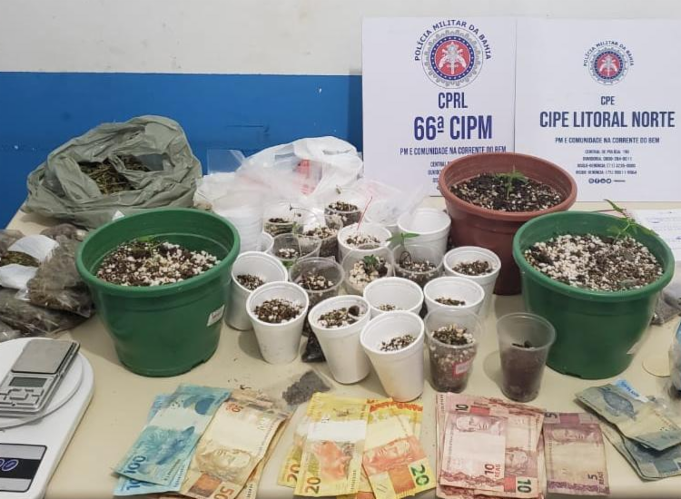 Após conversa inicial, o suspeito confessou que tinha mais entorpecente dentro da sua casa. Em um dos cômodos os policiais encontraram 12 pés de maconha, quatro pacotes com sementes, vasos, duas máquinas para cartões, duas cadernetas com anotações do tráfico e R$ 1,1 mil.