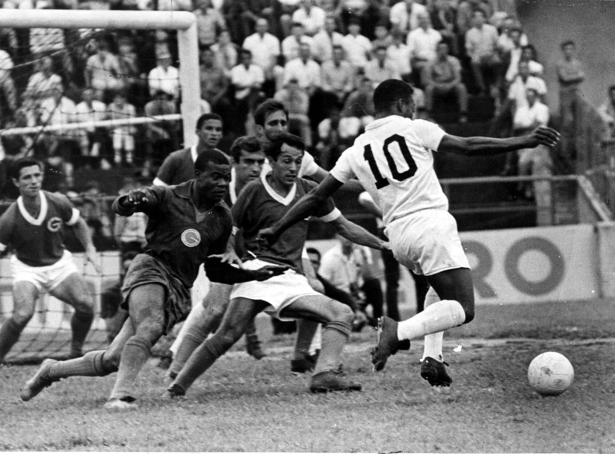 Pelé, com a camisa 10 do Santos, é cercado por jogadores do Guarani durante jogo do Paulistão de 1969 - Foto: Reprodução | Arquivo Estadão