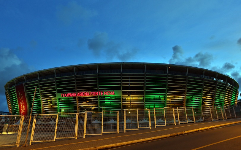 A Itaipava Arena Fonte Nova iluminada externamente nas cores verde e amarelo - Foto: BAPRESS