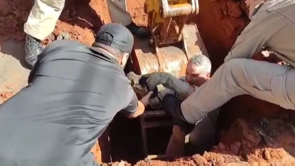Uma cadela filhote fugiu de casa e caiu em uma galeria pluvial em Cianorte, no Paraná. Ela foi retirada do buraco após uma ação do Corpo de Bombeiros que envolveu o uso de uma escavadeira, visando o resgate do animal da forma mais segura. O caso foi registrado no sábado, 17.