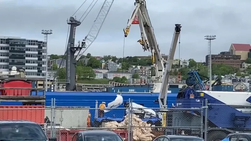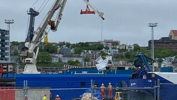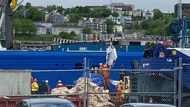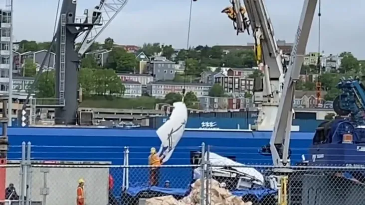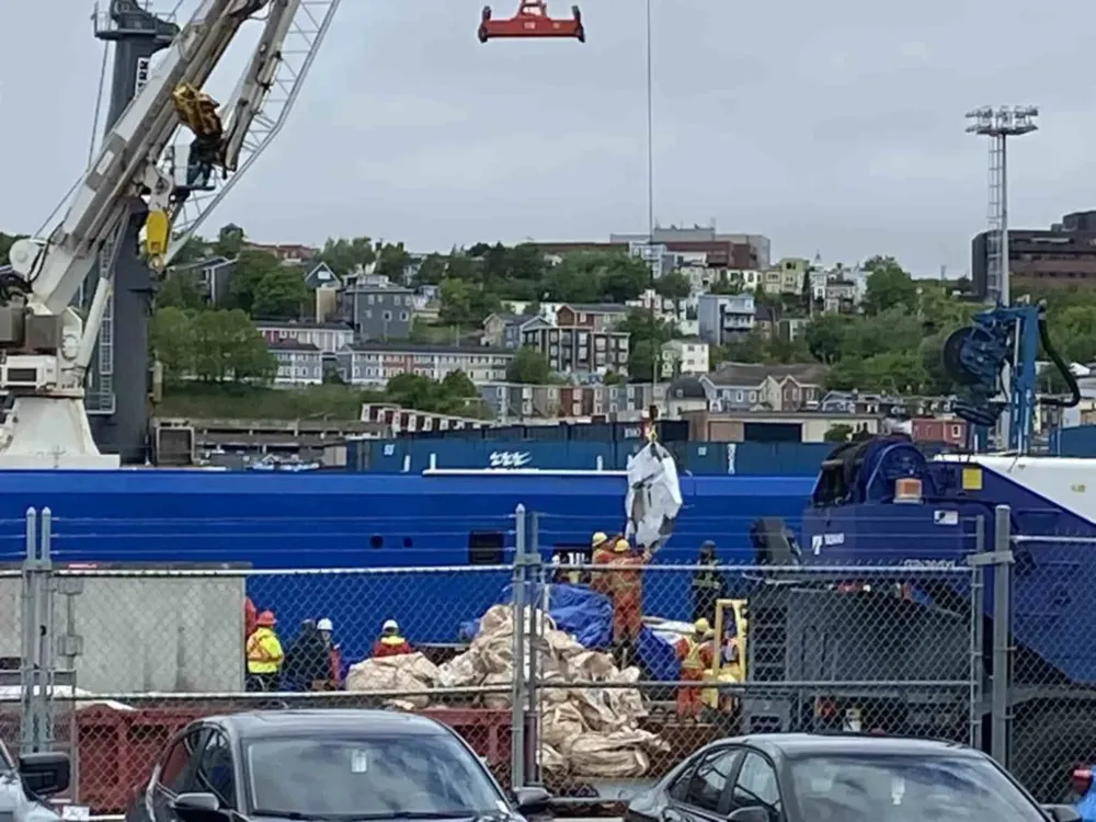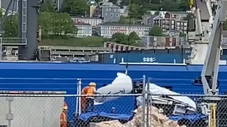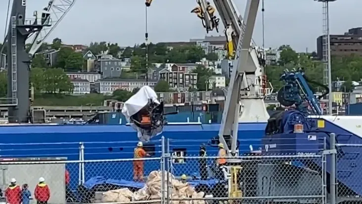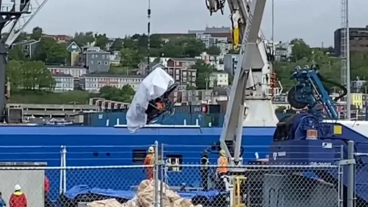 Imagens de televisão mostraram o que parecia ser a ponta da embarcação e um painel lateral com componentes eletrônicos e cabos pendurados enquanto os restos eram içados de um barco a um caminhão na plataforma, em um terminal da Guarda Costeira do Canadá, na cidade de St. John's.
