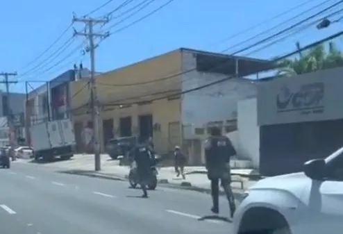 Uma situação inusitada foi registrada na quinta-feira, 24, no meio da avenida Santos Dumont (Estrada do Coco), no município de Lauro de Freitas, na Região Metropolitana de Salvador (RMS). Dois policiais correm atrás de um homem, que atravessa a pista no meio dos carros, mas é capturado em frente a uma loja de materiais de construções.