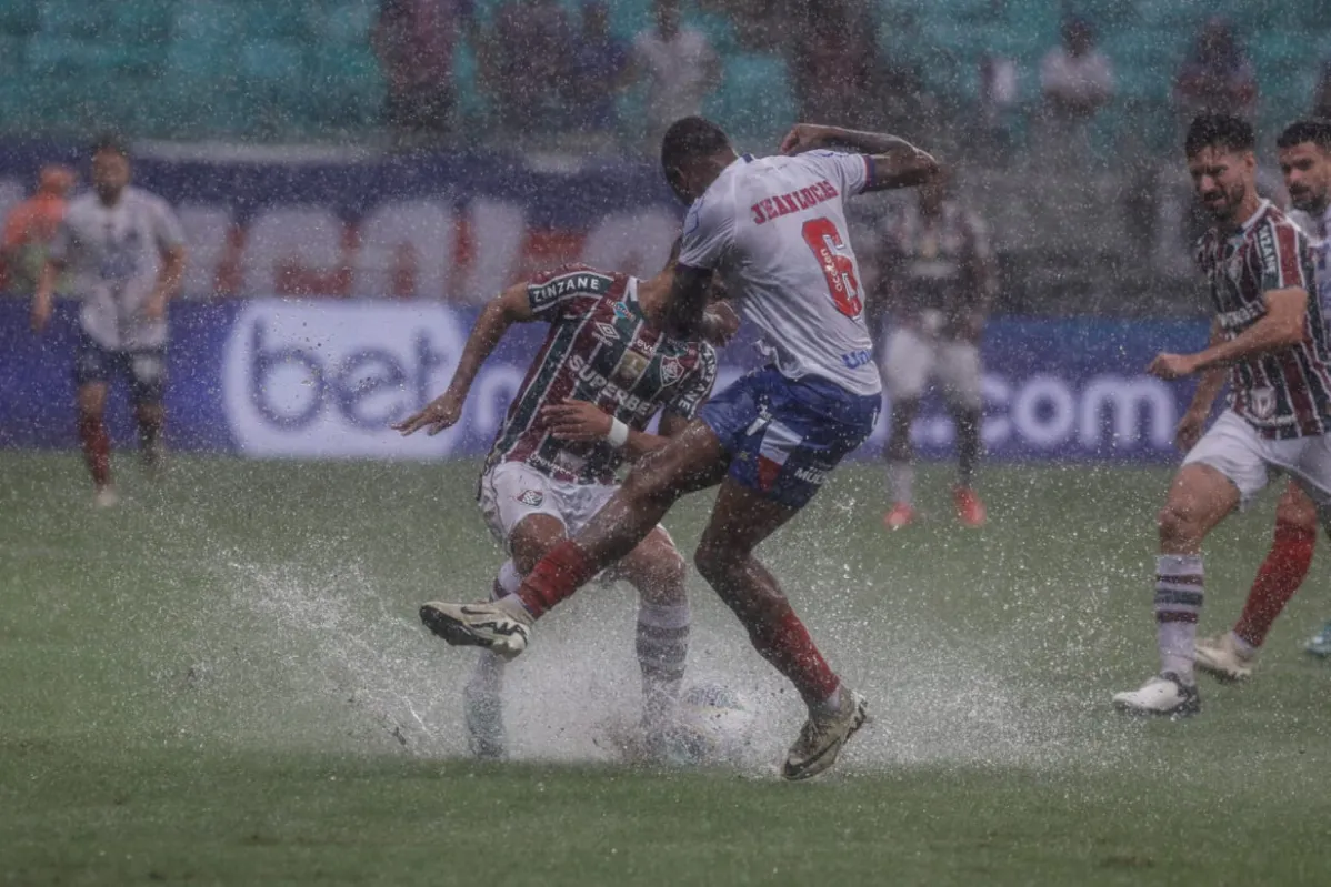 A partida entre Bahia e Fluminense, pela 3ª rodada do Campeonato Brasileiro foi paralisada aos 16 minutos do primeiro tempo por conta das fortes chuvas que caem em Salvador. Desde cerca de uma hora antes do início da partida com chuva forte, o gramado ficou encharcado e repleto de poças d’água.