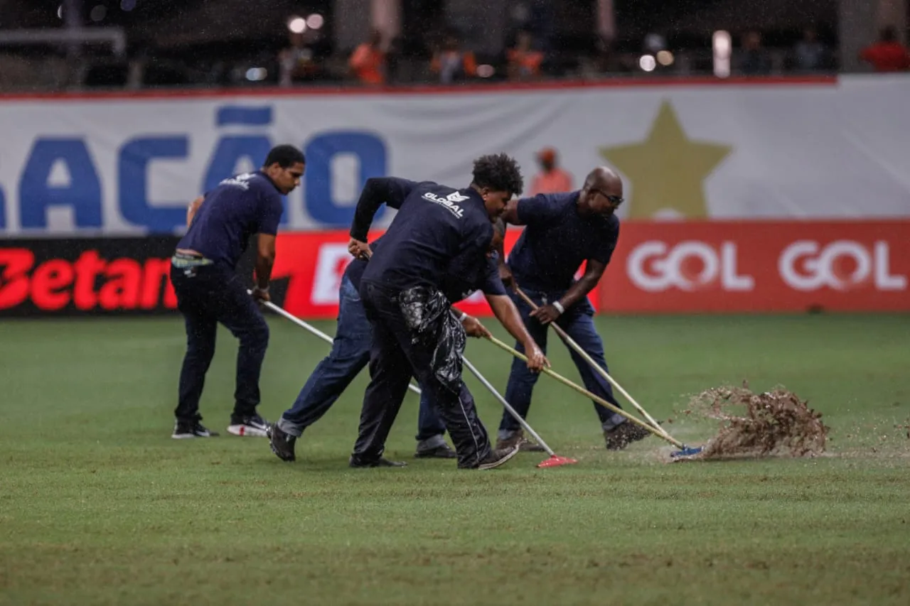 De acordo com a Codesal, apenas entre 21h e 22h, na região da Arena Fonte Nova, choveu cerca de 18mm. Após conversa com os capitães das duas equipes, o árbitro paralisou a partida e fez a primeira avaliação depois de 30 minutos, quando constataram que a chuva diminuiu e o gramado apresentava uma leve melhora.