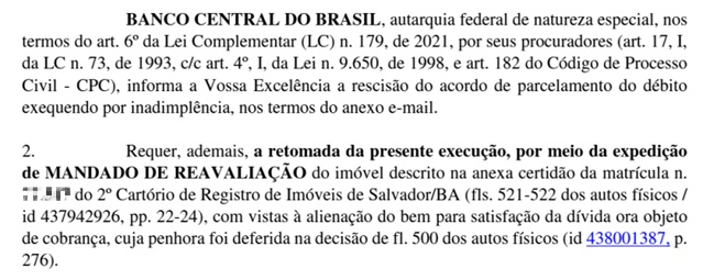"Requer, ademais, a retomada da presente execução, por meio da expedição de MANDADO DE REAVALIAÇÃO do imóvel descrito [...], com vistas à alienação do bem para satisfação da dívida ora objeto de cobrança, cuja penhora foi deferida na decisão de fl. 500 dos autos físicos", diz o documento enviado pelo Banco.